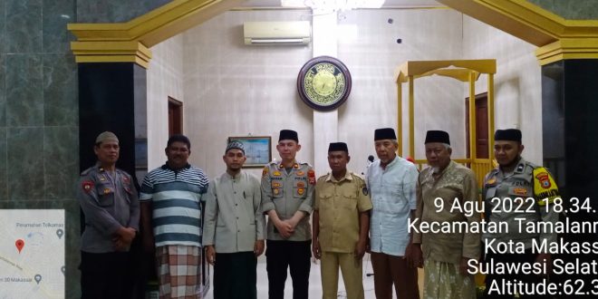 Makassar, Di Mesjid Ats Tsabat Kompleks perumahan Tamalanrea Mas Kel Tamalanrea Kec Tamalanrea Makassar, Kapolsek Tamalanrea Kompol Dr. Saharuddin, SH, MM melaksanakan sholat Magrib berjamaah dalam rangka Safari Kamtibmas yang ditingkatkan, Rabu (10/8/2022)