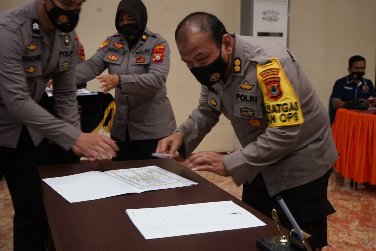 Makassar – Sosialisasi dan Penyerahan Rendisgar / Dipa T.A.2021 serta penandatanganan pakta integritas jajaran Polrestabes Makassar berlangsung di Aula Mappaoddang mako polrestabes Makassar, Kamis (24/12/2020).