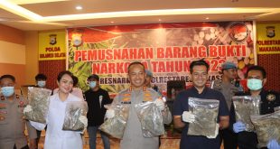 MAKASSAR – Satuan Narkoba Polrestabes Makassar melaksanakan kegiatan pemusnahan Barang Bukti Ganja seberat 3 Kilo Gram merupakan hasil tangkapan di Kompleks BTN Minasa Upa Kota Makassar pada tanggal 03 April 2023. Pemusnahan barang bukti Narkotika tersebut dilakukan dengan cara memasukkan ke dalam Tong Drum kosong kemudian dibakar hingga habis tidak tersisa berlangsung di Polrestabes Makassar, Rabu (31/5/2023). Kegiatan pemusnahan dihadiri …