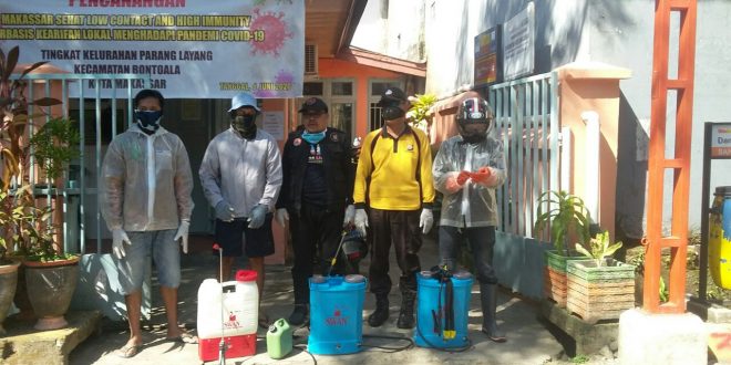 Bhabinkamtibmas bersinergi dengan Petugas kelurahan secara mandiri dan swadaya melakukan Penyemprotan Disinfektan yang dilakukan di lokasi yang biasa digunakan untuk nongkrong dan kumpul-kumpul warga kelurahan Bontoala Parang.