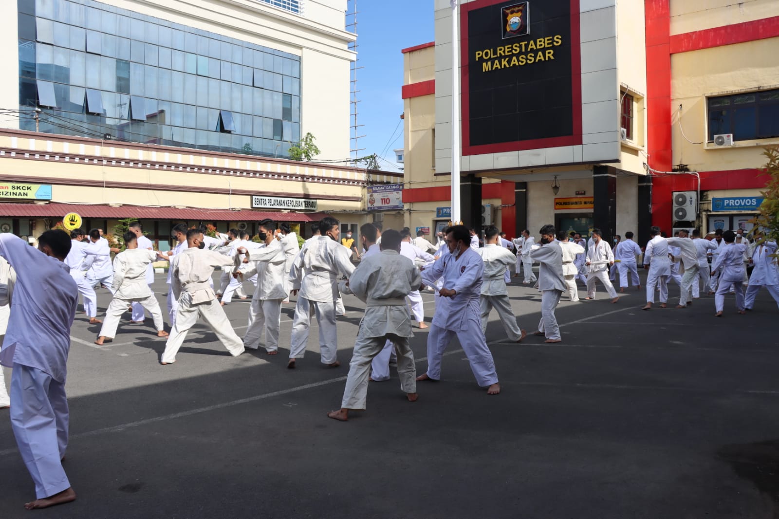 MAKASSAR – Personil Polrestabes Makassar melaksanakan latihan beladiri Polri berlangsung usai melaksanakan olaraga bersama di halaman Mako Polrestabes Makassar, Jumat (18/2/2022).