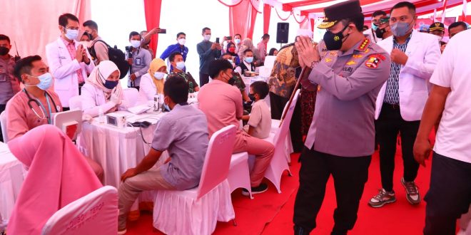 NTB – Kapolri Jenderal Listyo Sigit Prabowo meninjau secara langsung pelaksanaan akselerasi vaksinasi di Rumah Sakit (RS) Mandalika, Pujut, Lombok Tengah, Nusa Tenggara Barat (NTB). Kegiatan tersebut juga diselenggarakan serentak di provinsi seluruh Indonesia.