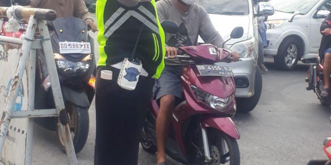 Makassar – Meski situasi dan kondisi tengah dilanda musibah dengan merebaknya wabah virus Corona (COVID-19), tidak membuat surut dan meninggalkan kewajibannya sebagai anggota kepolisian yang mengemban tugas fungsinya sebagai Polantas.