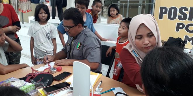 Di posko pengungsian wilayah Biringkanaya tepatnya di pasar sentral BTP Tim Urkes Polrestabes Makassar juga hadir memberikan pelayanan kesehatan secara gratis, Kamis (24/1/2019).