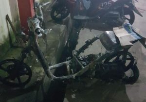 Anggota Polsek Mariso yang tiba di tkp mengamankan pelaku dan membawa ke Polsek Mariso. Selain tersangka anggota juga membawa barang bukti sepeda motor hangus terbakar yang digunakan tersangka. (Hms/Bs)