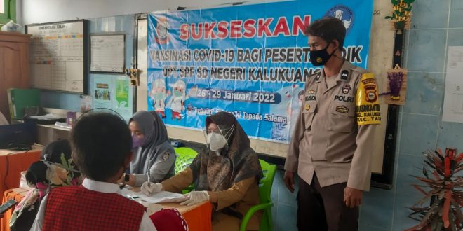 Bhabinkamtibmas, Aipda Rusdi mendampingi Anak yang di vaksin sekaligus pantau situasi dalam pelaksanaan vaksinasi yang berlangsung di SDN Kalakuang Kelurahan Kalukuang Kec. Tallo, Kecamatan Tallo, Selasa (01/03/2022)