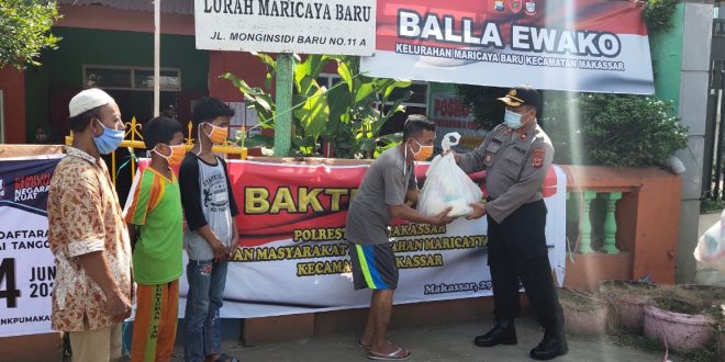 Kompol Kodrat yang didampingi oleh Wakapolsek Makassar Polrestabes Makassar AKP A. Awad dan Kanit Binmas Iptu H. Jabir, secara simbolis menyerahkan bantuan sembako dari Kapolrestabes Makassar Kombes Pol Yudhiawan kepada beberapa warga Kel. Maricaya Baru, Kec. Makassar.