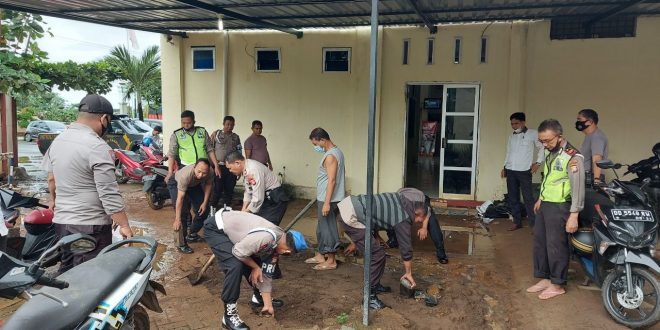 Makassar – Personil Polsek Tamalate Polrestabes Makassar dipimpin Waka Polsek Tamalate Iptu Amrullah bergotong royong melakukan kerja bakti pengerjaan parkiran di halaman samping Mako  Polsek Tamalate Jln Danau Metro Tanjung Bunga, Senin (01/02/2021).