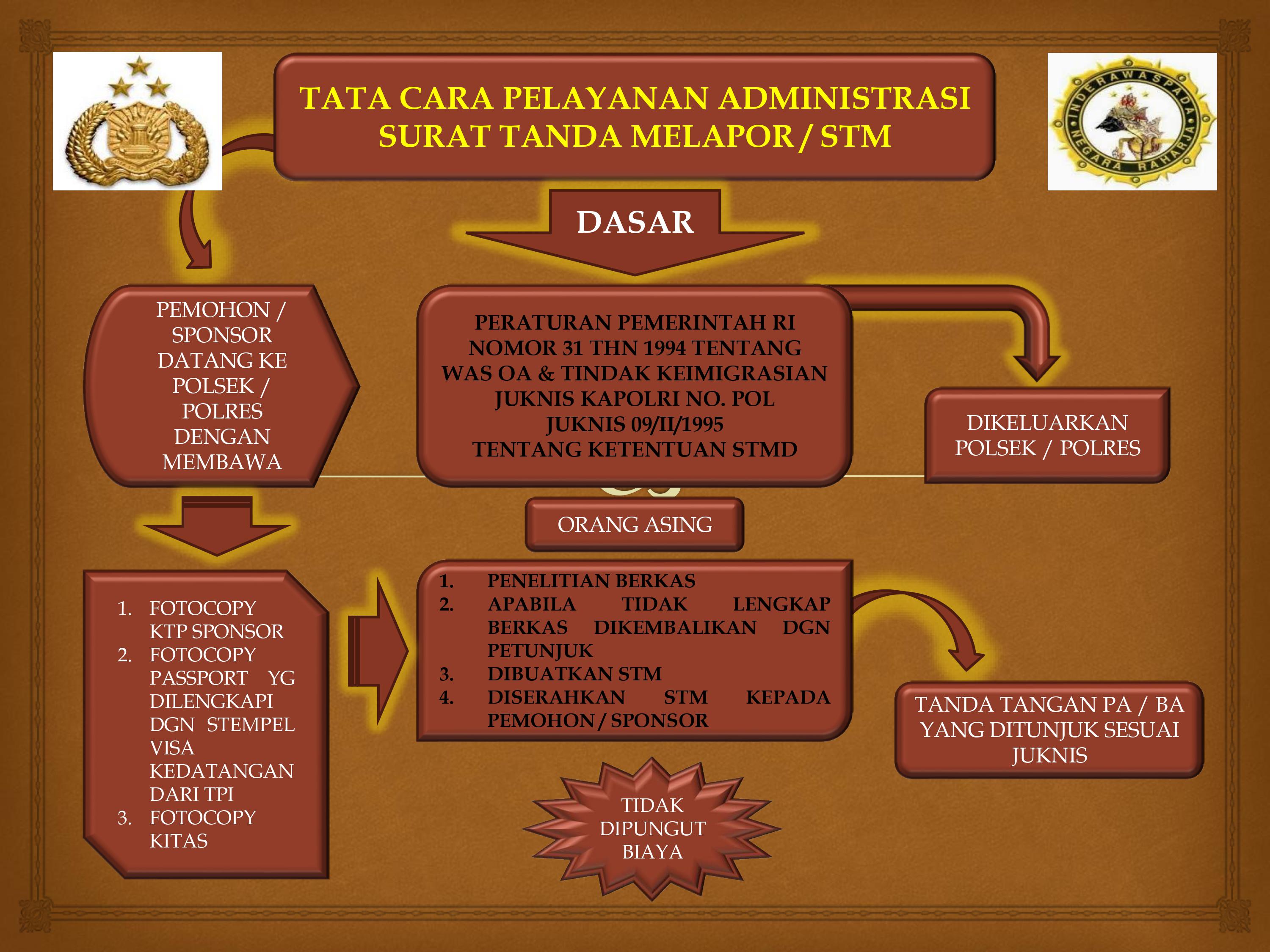 Bagi WNI yang akan keluar Negeri, selain melengkapi persyaratan tersebut, wajib dilengkapi dengan foto copy pasport dan SKCK diterbitkan oleh POLDA (Polrestabes hanya mengeluarkan Surat Rekomendasi Catatan Kepolisian).